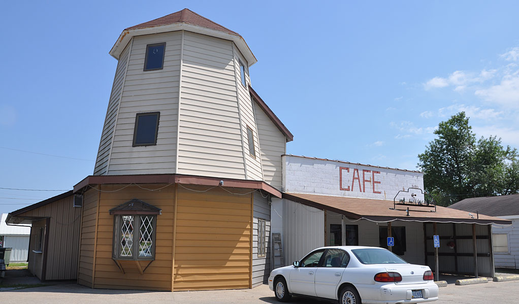 This building from Corydon. I’m wondering if that tall structure wasn’t originally a faux windmill. I went looking for a building in Albia that must be gone now. There was a chain of windmill gas stations in south Iowa. I believe they were built in the 1920s for Harry Gholson and called “Dutch Service” stations. There were also motel cottages built in conjunction with this station/restaurant (a gas/food/lodging tourist complex). No sign of motel rooms near this building now.