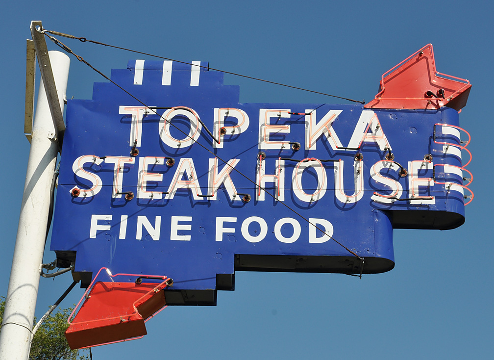 We’re in Topeka now — my first time which was very exciting. And it was just mind-blowingly great in every way. Great signs & old buildings. Mid-century buildings all over the place. For my money, I’d pick Topeka as a vacation destination over Palm Springs if you like mid-century. Sure, maybe the examples in PS are more extraordinary — but not as plentiful or as heavily tweaked. If you exclude houses (I usually do!), there are maybe about a dozen or so mcm buildings in PS. But in Topeka, I bet there are 200! PS’s mcm buildings get As while Topeka’s might get C+/B-. But I bet the hotels are a heckuva lot cheaper, too. And off the top of my head, I’m not remembering any neon signs or Art Deco in PS either. Topeka’s got other fun raggedy, weird stuff, too, that PS doesn’t have. Hands down, Topeka’s the winner in my book!