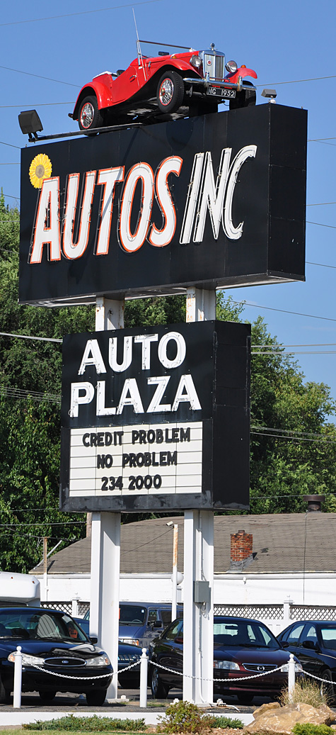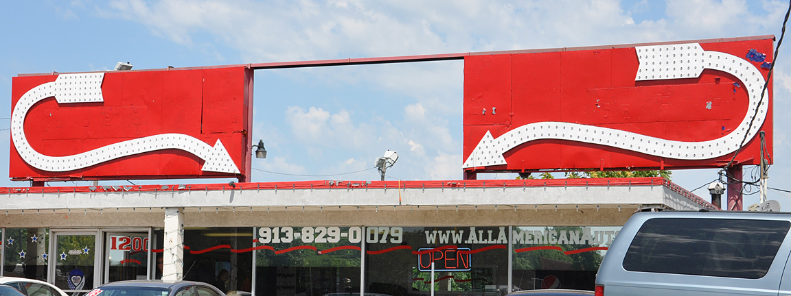 I’m crazy for this pair of arrow signs at a used car dealer in Olathe: