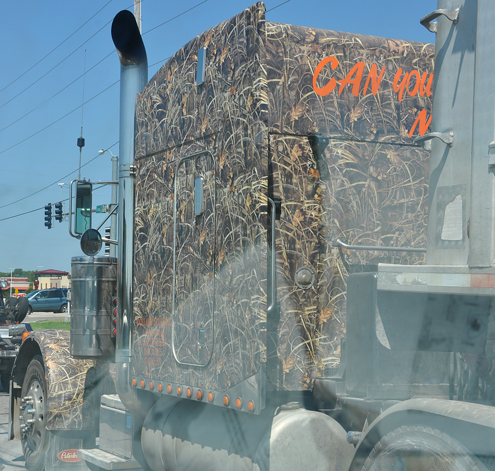 A truly crappy photo but I’ll include it anyway. Taken while driving in Lawrence so you get glare and bugs. But I hope you can make out the neat camo cab — is that wheat or what? I’ve never seen a truck with this sort of thing before.
