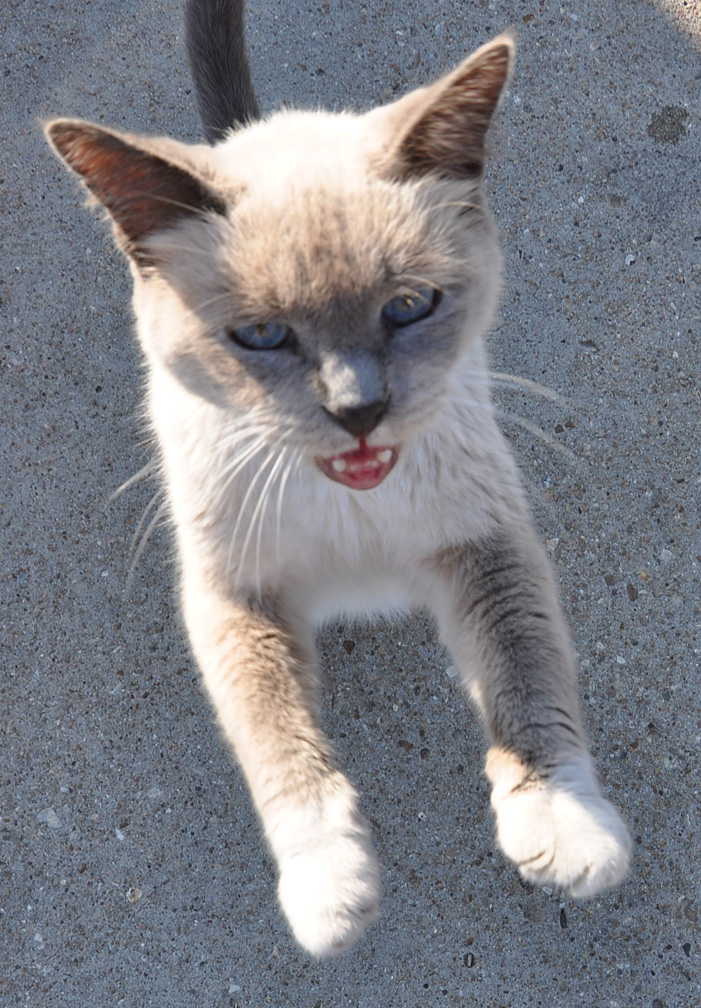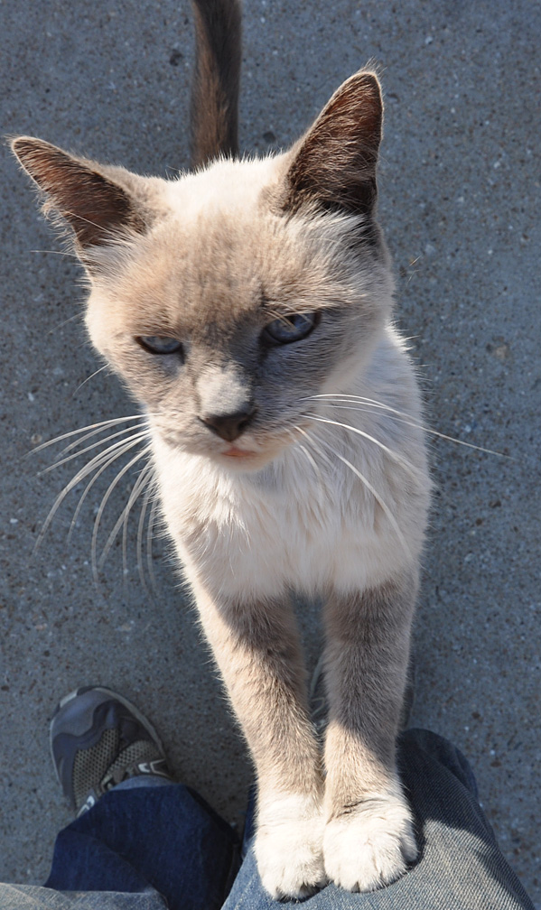 Now here’s the last thing you’d expect to see at my blog: a kitty! While I was shooting a gas station in Emporia, this guy came up to me meowing in a friendly way. Despite the frightening expression/pose of this first photo, it was really just a playful sort of bounce as I was focusing on him/her. I babytalked to him and he continued meowing and stood up against my leg. I assessed his weight was a little thin but not starving. Maybe the station’s or a neighbor’s pet. But not freaky feral. And with four dogs in the van, there wouldn’t be much I could do. Except I did go get a giant handful of food for the guy. At first, he questioned what it was (not normal cat food smell I’m sure) — but then got down to eating it. I wish him well.