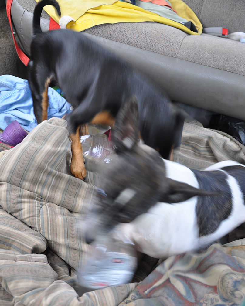 Since the troops are a bit restless from being confined to the AC-ed van (not so much outdoor running in 100 degree heat), we’ve been having “Bottle Time!” every afternoon. Since I always have a few D.C. empties on hand, it’s free fun for all. Nik & Grem flail and chomp away while Grip & Fix bark at them to “stop it!”. Yes, someday, I’ll learn to take actions shots with my high-tech camera — but maybe it’s better this way — very Balla-esque, no?
