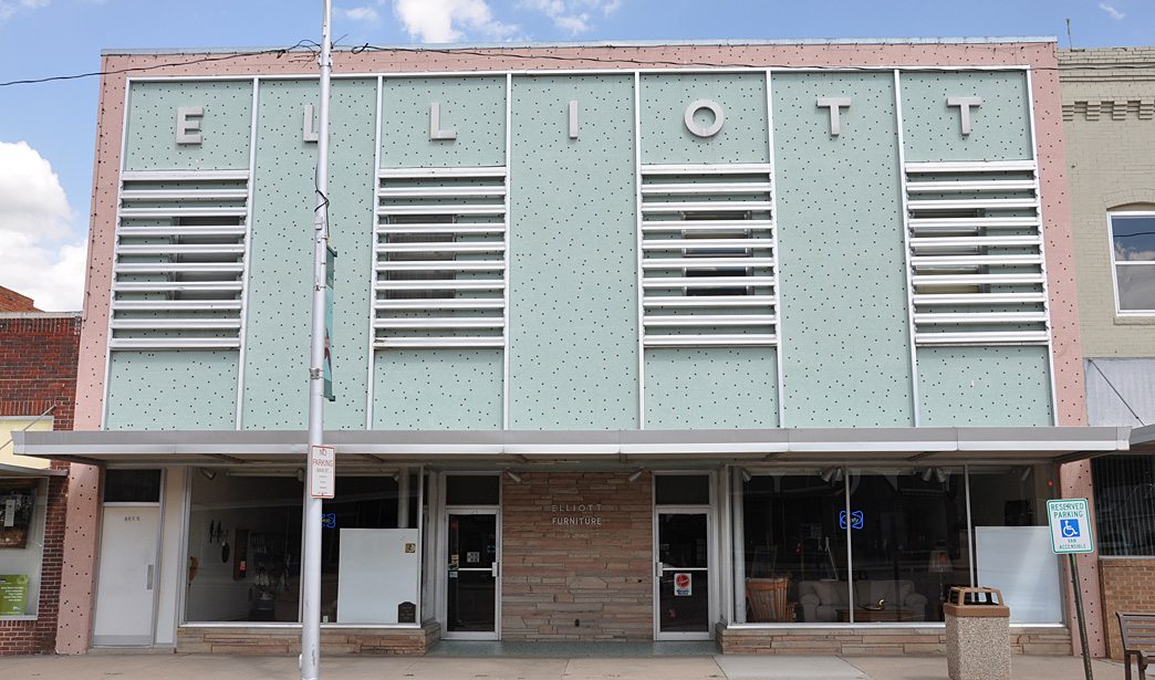 Goodland is chock full of interesting stuff for such a small town. This intact mid-century furniture store has it all: louver screens over the windows, metal letters, stone, and tile:
