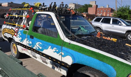 Erika’s art car, “Scout”, was there at the gallery where the planning is taking place. I could not get a good shot of it since it was in a tricky spot and the sun was not in my favor. Suffice it so say there are lots of dinosaurs and other critters embedded in tar, children’s ponies in the back pierced by arrows, astroturf, etc. and “Combat Generica” emblazoned on the side. Here’s another photo of Scout but it still doesn’t show much: