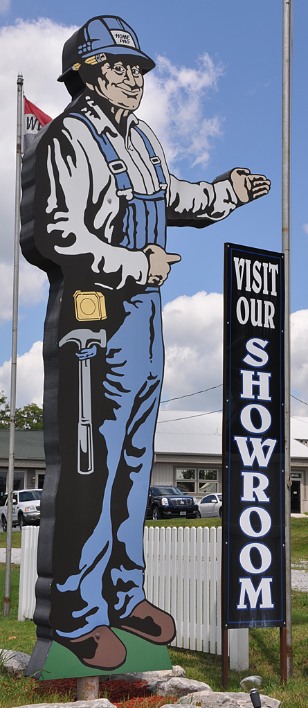 From Joplin, in front of HomePro. Love this guy. Love all construction worker type signs. Okay, maybe any signs with people. Or animals or things or… I can’t tell whether this is entirely new — or a replica of an older version — or a combo of the two (same frame, new panels):