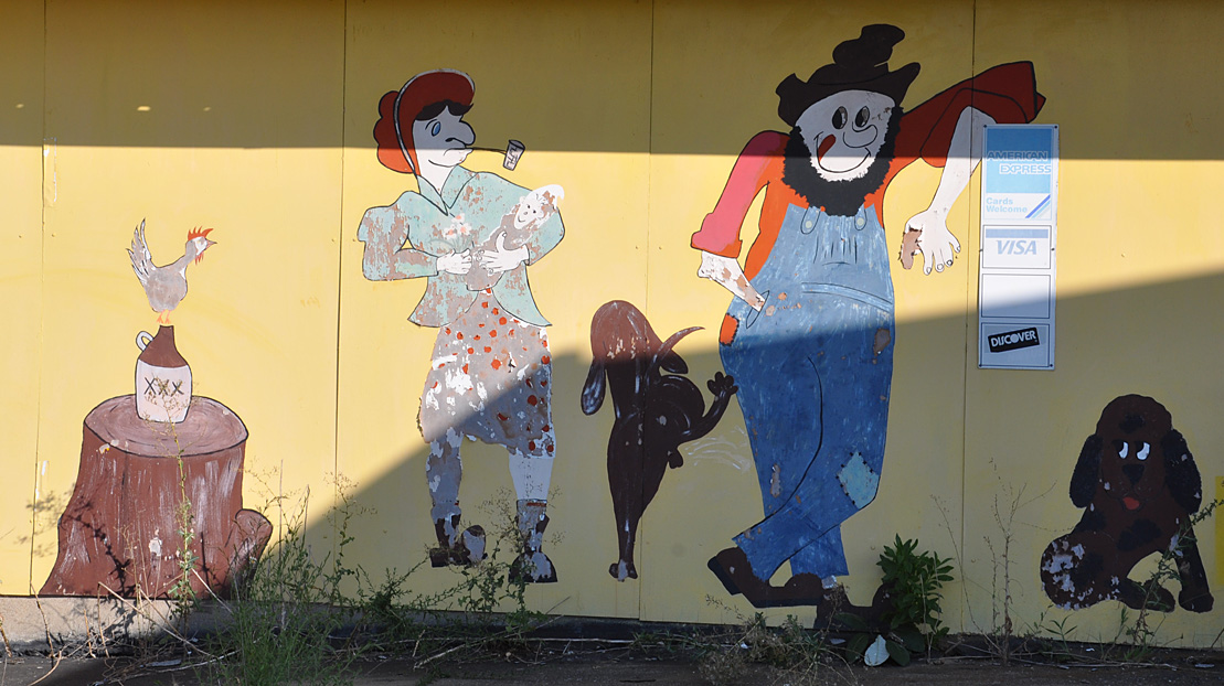 And last one for the day — from Sarcoxie. I have re-entered the Ozark Mountain region so it’s appropriate to include this one. Although hillbilly imagery has gotten incredibly rare. This was at a gas station, turned souvenir/fireworks stand, now long closed. Worth clicking large.
