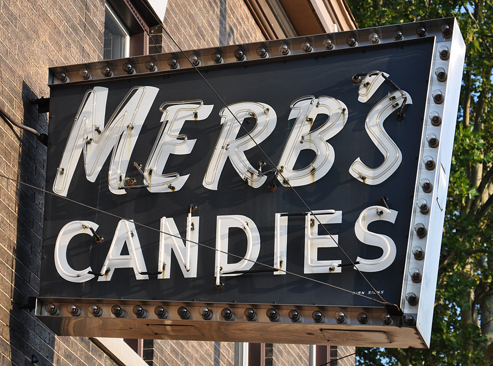 Merb’s. Just love the name. Please don’t ruin my fantasy and tell me that it’s a last name. I want to believe that 80-year old Merb is up on that ladder every month replacing those bulbs when they go out. A pinky glow tells me the neon works perfectly. Oh, sure enough — thanks Lynne: