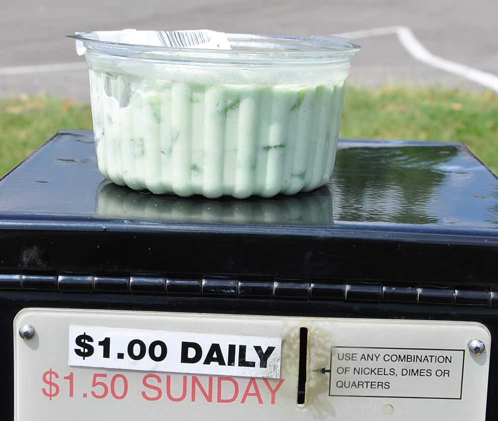 Time for a snack! One of my purchases at a Schnuck’s Super Center last night was this little item. The lime green color got my attention in the deli case and I was perusing for my usual cheese or meat (dogs) snacks. It’s called Watergate Salad — and I guess everyone’s heard of it but me. Watergate? Like Nixon’s Watergate? It’s main ingredient is pineapple and then a long list of chemicals. Reluctant but curious. I did my on-line research later and it’s supposedly pistachio that gives it that color. Yeah, right. The pineapple chunks are dark green like cucumber skin. It basically tastes like pineapple and whipped cream. So yeah, sweet, very sweet, and creamy! Three dogs loved it — Grippie wouldn’t touch it. The only other thing she won’t eat is citrus.