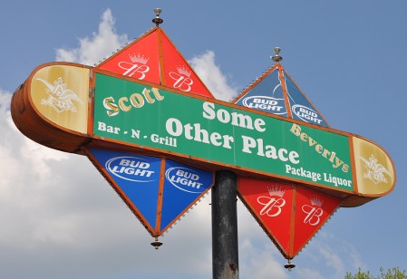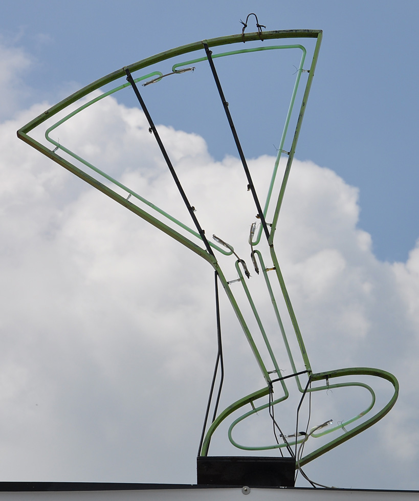 Your opinion matters. When shooting signs, I often wonder, particularly with these skeletal types, whether to shoot with clouds — or without. Sometimes just standing a foot or two away in a different spot produces such different results. So, would you prefer this guy with a pure blue sky — or the way he is? Oh, and by the way, this neon martini is at Danno’s Pub: