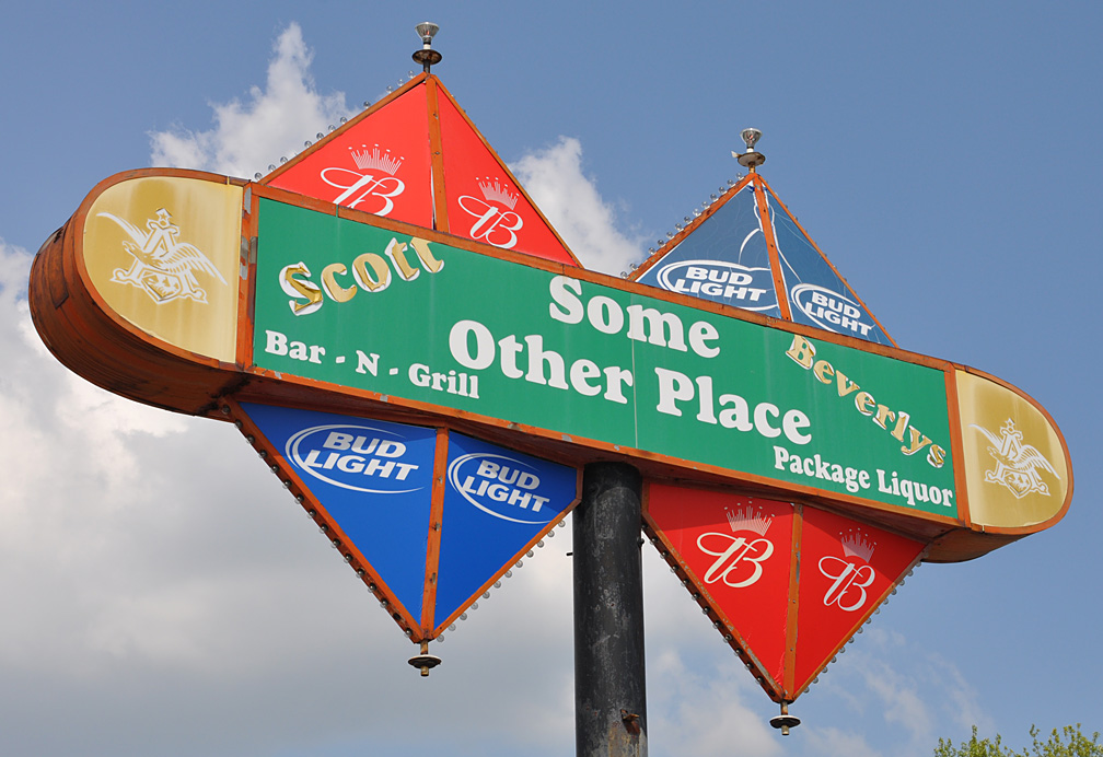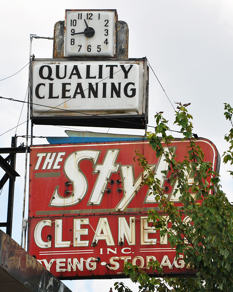 This pile-up of a sign probably started with just the neon, don’t you think? Nice colorful fins. But the clock has ancient deco-y fins also — so maybe not — maybe one big silly unit? Trees. You love them, you hate them. They can be real troublemakers. And I have no plans to do a Midwest trip in the winter just to get bare branches in the way instead.