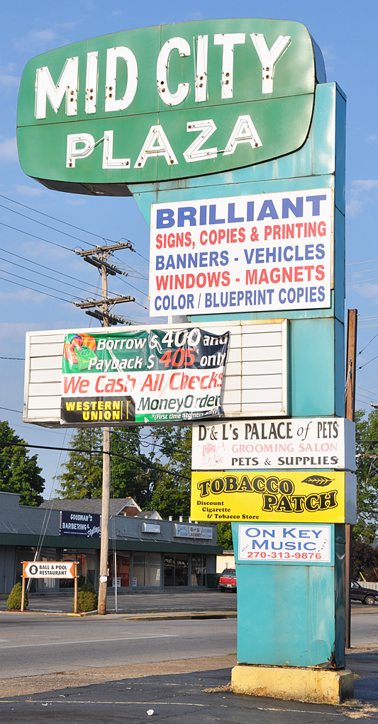 Another photo from Owensboro. This Mid-City Plaza sign sure looks like an adapted Frisch’s sign to me. The shapes are right but the top part would have been red (not green) porcelain enamel. Here’s an example from Ohio: