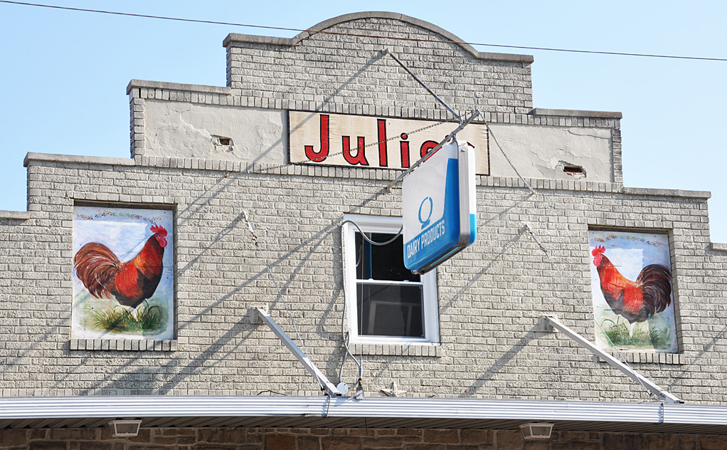 Oh dear, I’m not finding this one in my notes right now so I can’t tell you where it is. I just liked the combination of this one: the painted business name & roosters, the old plastic dairy products sign, and the building’s false front. I think this was a Mexican restaurant now but I’m not sure: