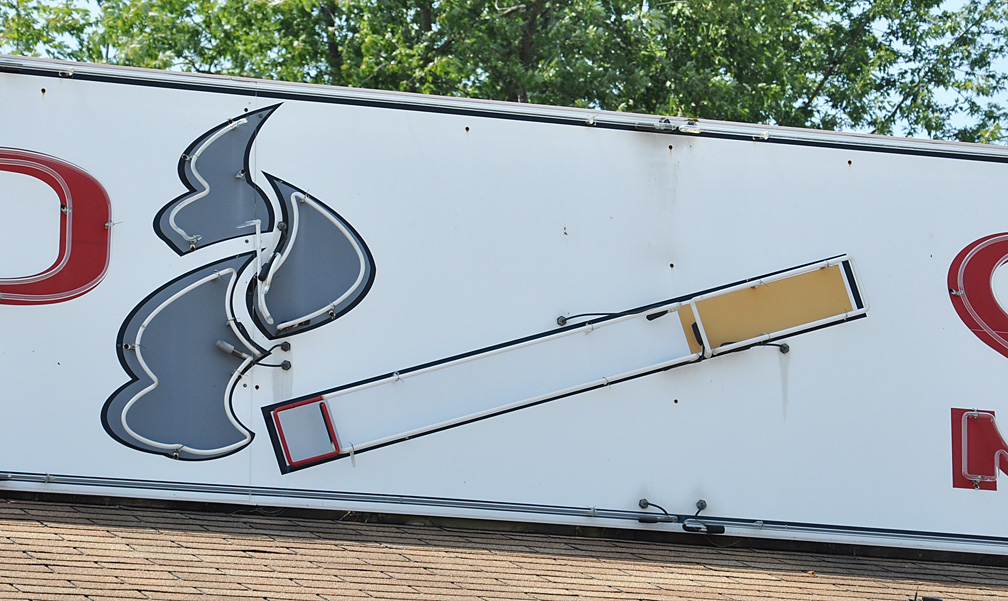 I can’t think of any neon signs with representations of cigarettes. Cigars, yes, but not cigarettes. This is at Carefree Cheap Smokes at the Marengo, IN exit off I-64.