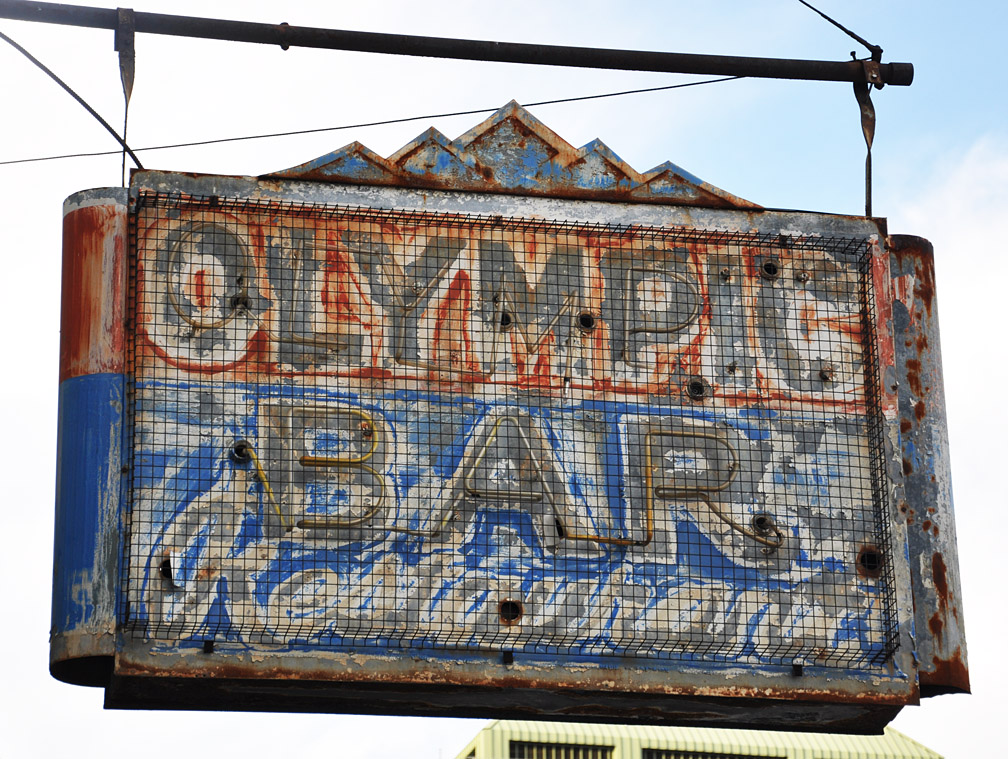 Here’s one for you rusty-crusty fans. I assume that metal mesh was put there to protect the neon ages ago. I can’t imagine that this sign is still lit at all now. There’s something inspiring about this sign’s resilience, no?