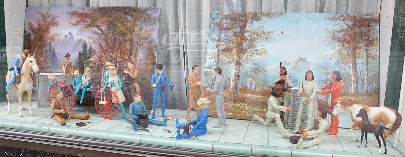 A residential (I think) window display. Is this scene depicting anything in particular — cowboys, cowgirls, Indians… Are these famous figures that I’m clueless about?
