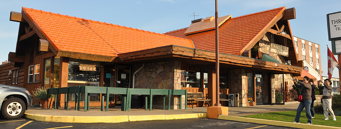 Still in Niagara Falls. I believe this was a Howard Johnson’s based on the orange roof tiles and the apparently missing steeple. But then again, the building shape just doesnt’s seem right. It’s almost like a merging of their gate lodge and restaurant buildings. Or maybe I’m just tired and forgetting some layout. Regardless, I was amused by the trading post makeover. And the tourists at the right. Koreans maybe? They were all giddy over the helicopter ride taking place on the left of the frame. I did the right thing and took a photo of the three of them together with their best camera.