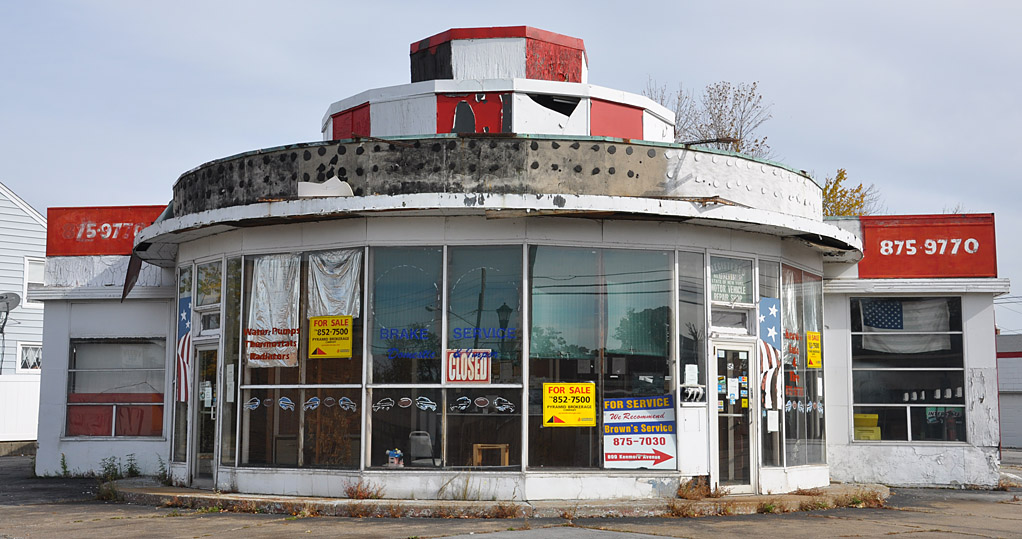 This was today’s kick to the gut. One of my fave Buffalo gas stations — now abandoned and denuded and probably doomed. Here’s a scuzzy photo from 2005 for comparison: