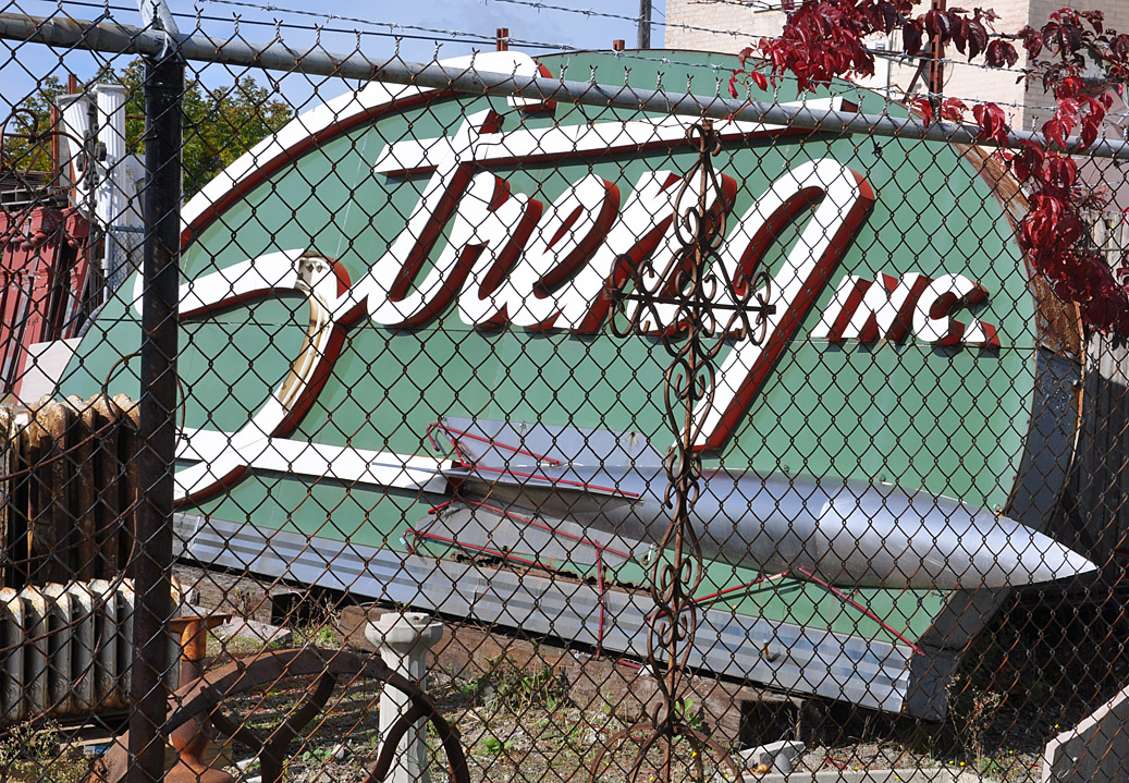 I went to one of those architectural salvage places hoping to get a glimpse of the old Tunmore Oldsmobile sign which I was told quite awhile back had been moved here. Apparently, no longer there that I could see — but there was this wonderful sign instead. No one to ask re: this one or the Tunmore sign since all locked up on a Sunday. Apparently from a quick Google poke, Streng was another local Oldsmobile dealer which closed in 1998. Oldsmobile was fond of rocket imagery in their ads and signs. But I haven’t seen another sign like this one though: