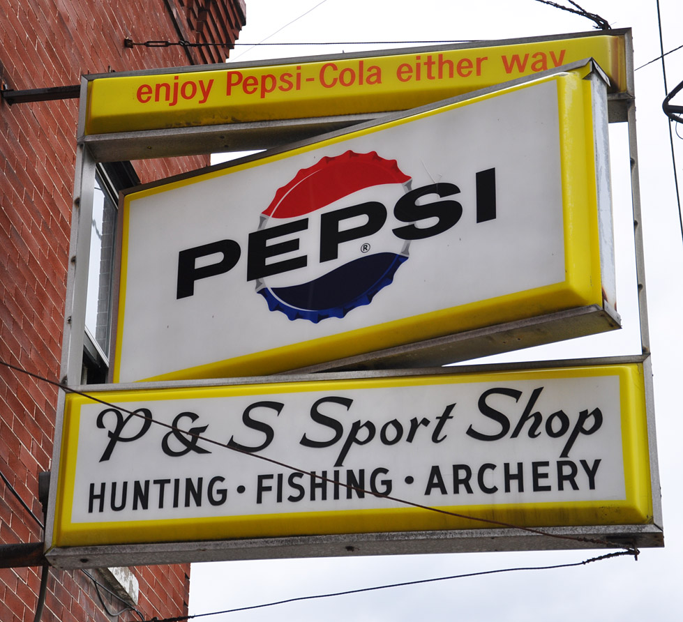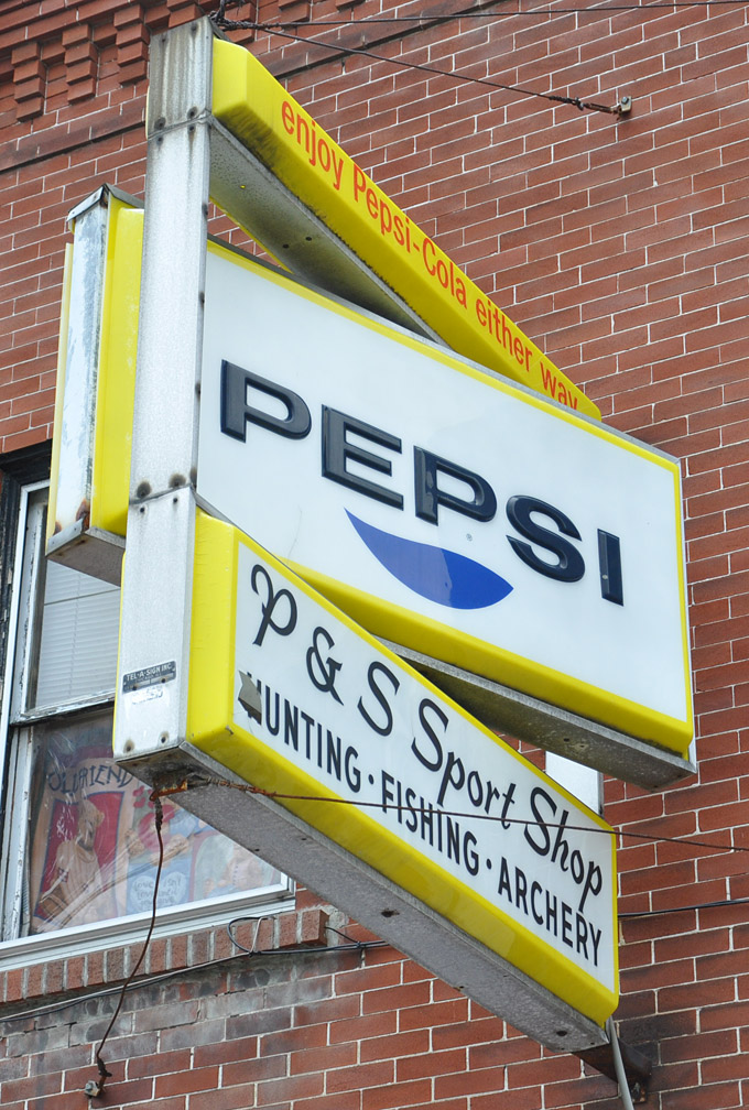 From Jamestown. A twirling plastic Pepsi sign. No longer twirling. Never seen one like it. There’s a pool place below now — so I’m just glad this sign is there at all.