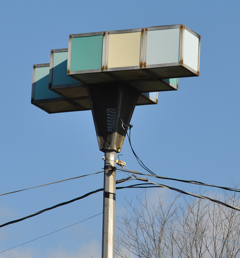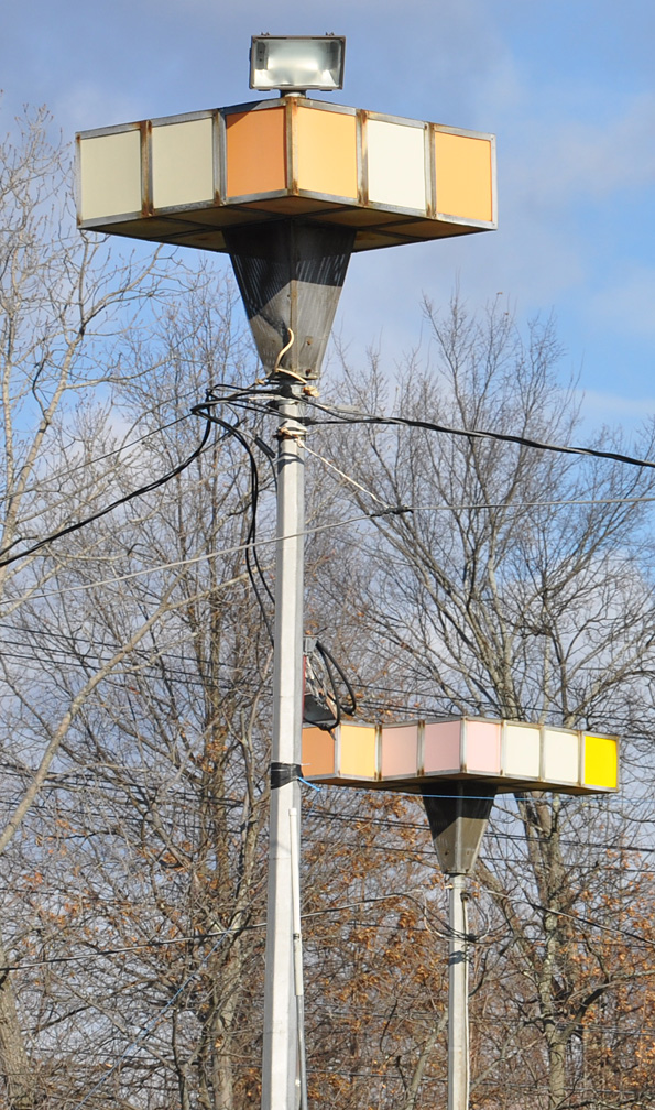 I wanted to check out Chief Towaco’s new paint job (his photo is over at my Flickr postings tonight) at the Orange County Fairgrounds in Middletown. The Fairgrounds always seems to be open when I’ve dropped by regardless of whenever the fair is. But I guess not on a Saturday and not this time of year. Locked up tight — believe me, I examined for any holes in the fence – nothing. But I was able to shoot The Chief from the highway somewhat. And I got some shots of the nifty lights. I’m told that these were originally installed at the New York World’s Fair in 1964. There are lots of them all over the grounds with different colors. I don’t know if these signs are still lit during the fair.