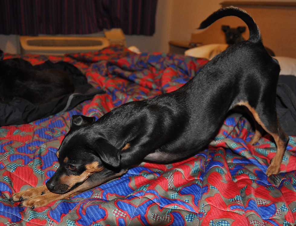 And yes, yes, the dogs are of course keeping me company. Here’s how we roll when we arrive at our Red Roof Inn, my motel of choice. Fix (lower left) heads for the pillows, Grem (top center) makes a lumpy pile with a tshirt of jacket, Grip (right) likes an article of clothing and to be near me…