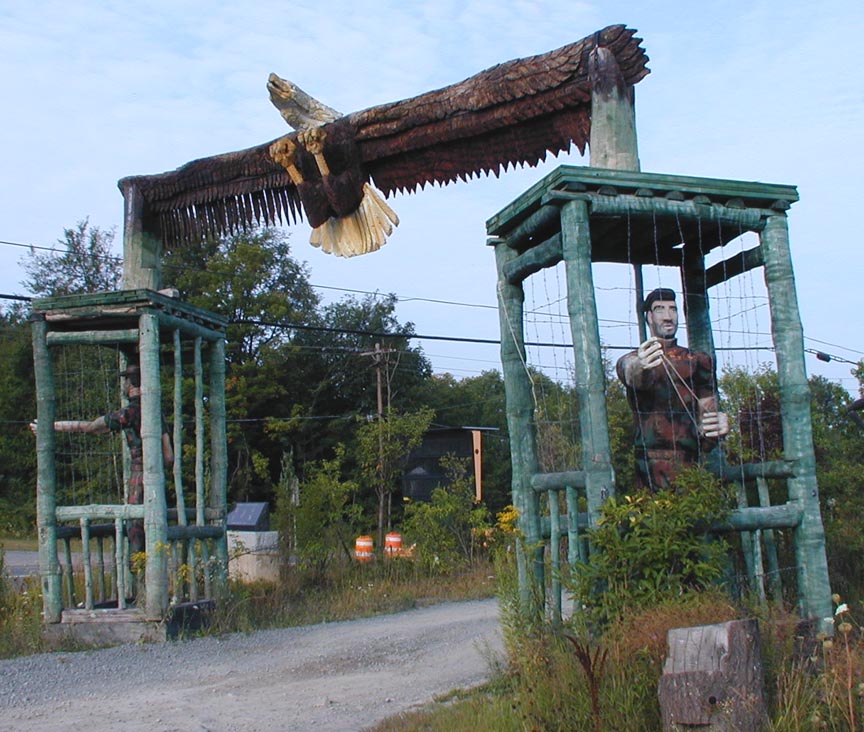 I was shocked to see what’s become of the carved wooden statues in Bethel. Apparently, there was a fire. Don’t know if it was a lightning strike or vandals or what. Here’s a photo I took in 2005 of the prisoners of war tribute: