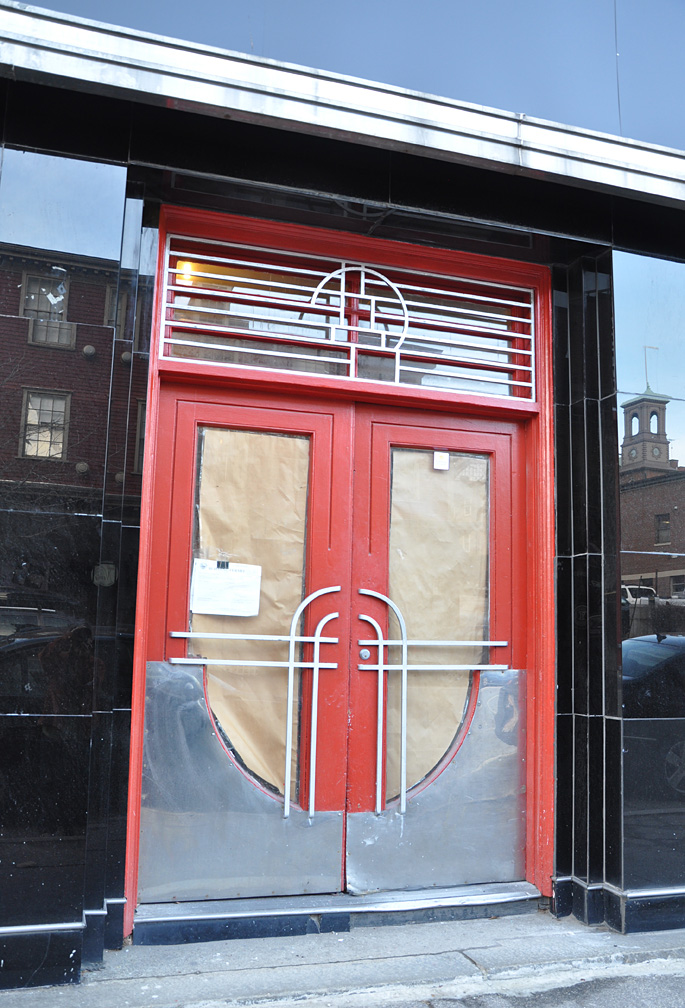 Still in Providence, but back in time. 1930s? 1940s? One Park Row. The woman closing up the coffee shop said it was Fain’s Carpeting and also a nightclub at one time. So, more homework. Sure enough “Fain’s Fine Carpet and Rugs” was here. But all I can find is the build date of 1873 and nothing about the ground floor remodeling. Vitrolite with metal — all appears vintage to me and not some later fake. Maybe some Providencians will chime in with the scoop on this one.