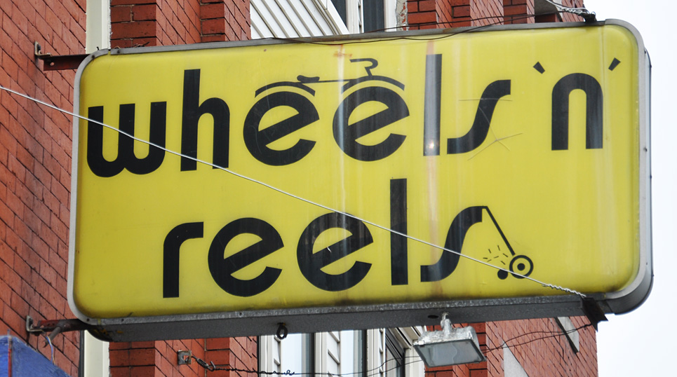 This sign from Lawrence, MA. Simple but I like a lot of things about it. The font, the name, the weird graphics (is that a fishing reel bottom right? looks more like a lawnmower). Also I like those plastic signs that bulge more towards the center. I’m no expert on this type — but it seems older than the embossed type plastic sign.
