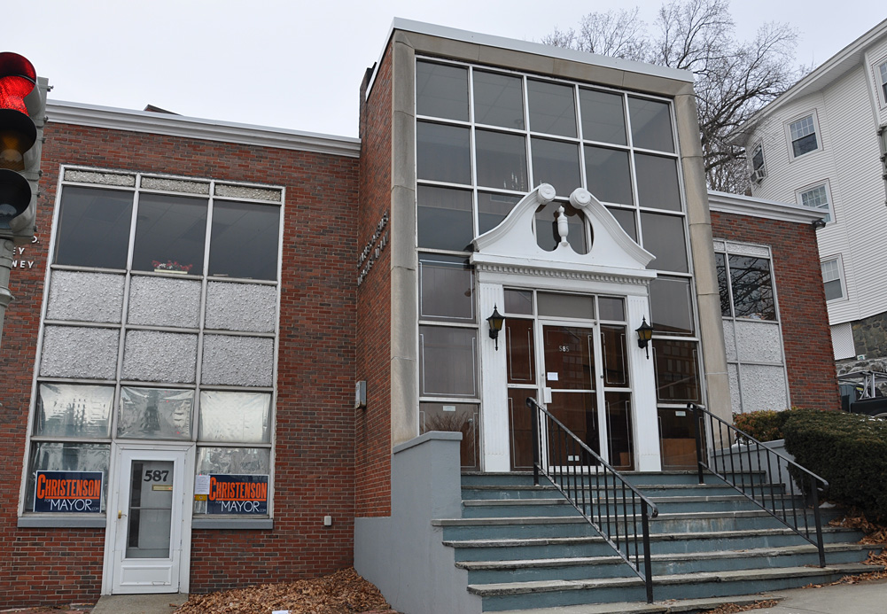 From Malden, MA: a little midcentury goofiness — Colonial embellished entrance with rocky patches and metal letters on the sidewall (more visible from the main road there).