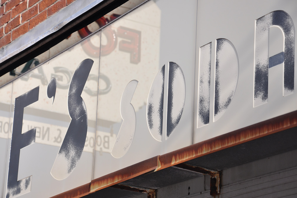The faded storefront sign is actually nicer and more interesting. I hope they don’t mess with it! The letters are actually… don’t know what they call it — but I call it reverse relief (lowered instead of raised).