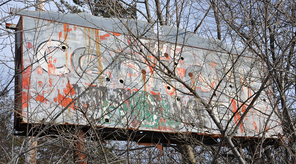 One more faded beauty before I return to gazing at this month’s Storm of the Century. About 5 inches out there now at 7pm. This one from Merrimac. You probably can’t see it at all when the trees grown in. Lettering looks like Coach House but it’s probably been repainted a half dozen times or more. No sign of a motel or restaurant on the lot now. Don’t overlook the little Colonial style pediment-y hole at the top of it: