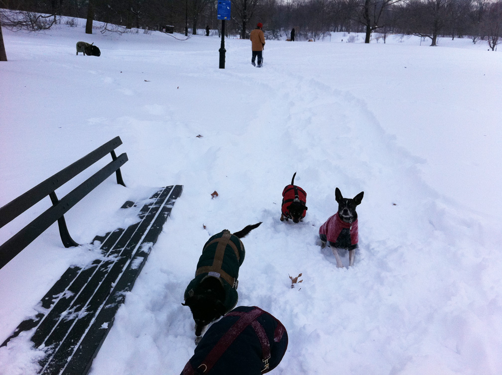 So some snow pictures as promised. I thought I’d be smart and take iPhone to the park instead of Dee (the real camera). But little “i” didn’t know what to make of the glare so the pictures were all pretty dark & crummy. I tried. It was brutal out there anyway. The snow has stopped — about two feet of it. Still blizzardy winds though that come up and blow snow in yer face – ouchy, cold and shocking.