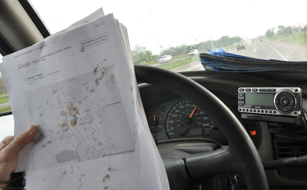 So, sick car, sick me… and I got my first (hopefully, my last) speeding ticket of the trip. It was really not fair! Coming into Sealy for a one-stop-shot of a fairly boring theatre. Speed zone changes from 55 to 35 pretty quick and I got radar-ed at 49. Just seconds after I made an emergency pit stop at a McDonald’s. So not right to pick on me when I’m at my lowest. First thing the cop said was “are you having a medical emergency?” which really gave me pause. How could he know? No, of course he didn’t. He just wanted to see if I had an excuse for speeding. I only said that I hadn’t noticed the sign and just then noticed things had gotten more downtown-ish and slowed down. He showed no mercy. But when I think of how much “excessive speed” I’ve been doing, this is really inconsequential. Folks drive REALLY fast in Texas. Like 90 on interstates where the limit is 70. Even the country roads have a 70 mph speed limit. This is getting me probably a dozen more cities in per day.