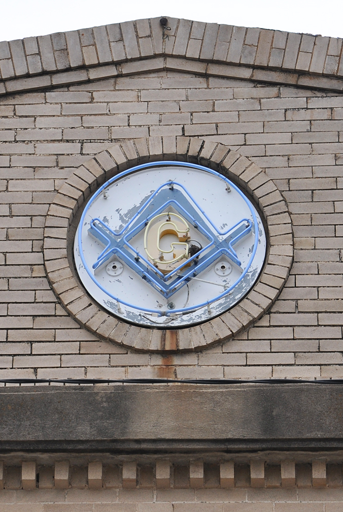 From Eagle Lake. Usually these Masonic signs embedded in the buildings are just done in relief. While loads of Masonic neon signs still out there — I’ve never seen an embedded one like this decorated with neon: