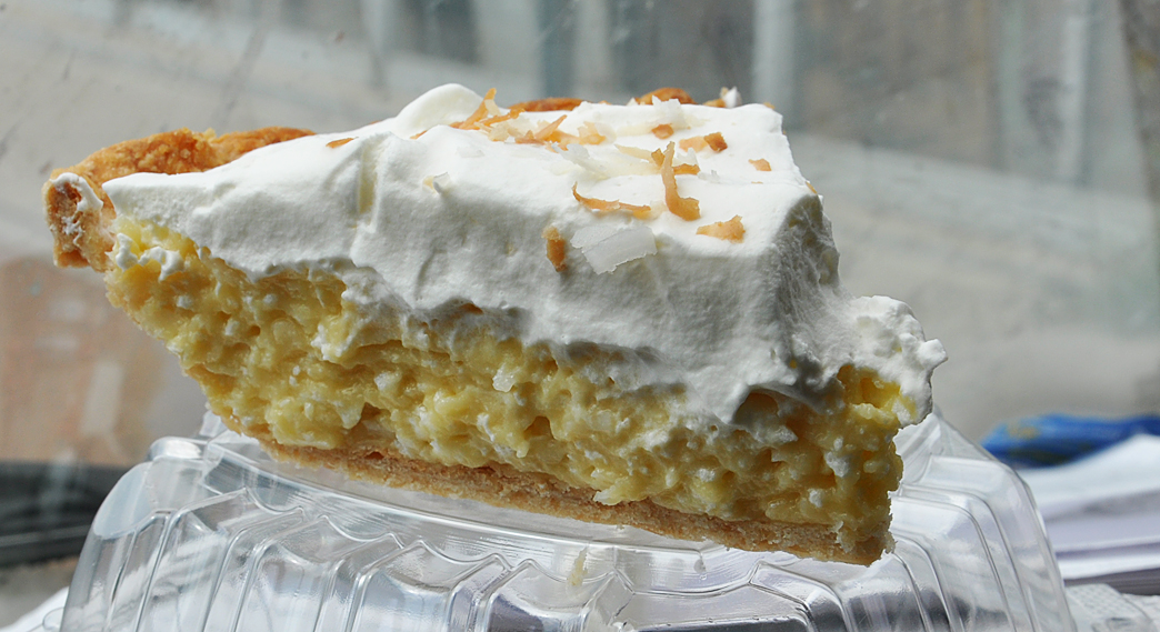 Anyhow, here’s my selection from the Filling Station Cafe across the street from his workplace. Yes, that’s coconut cream pie on the dash. For breakfast. Now that my stomach’s healthy, I have no shame.