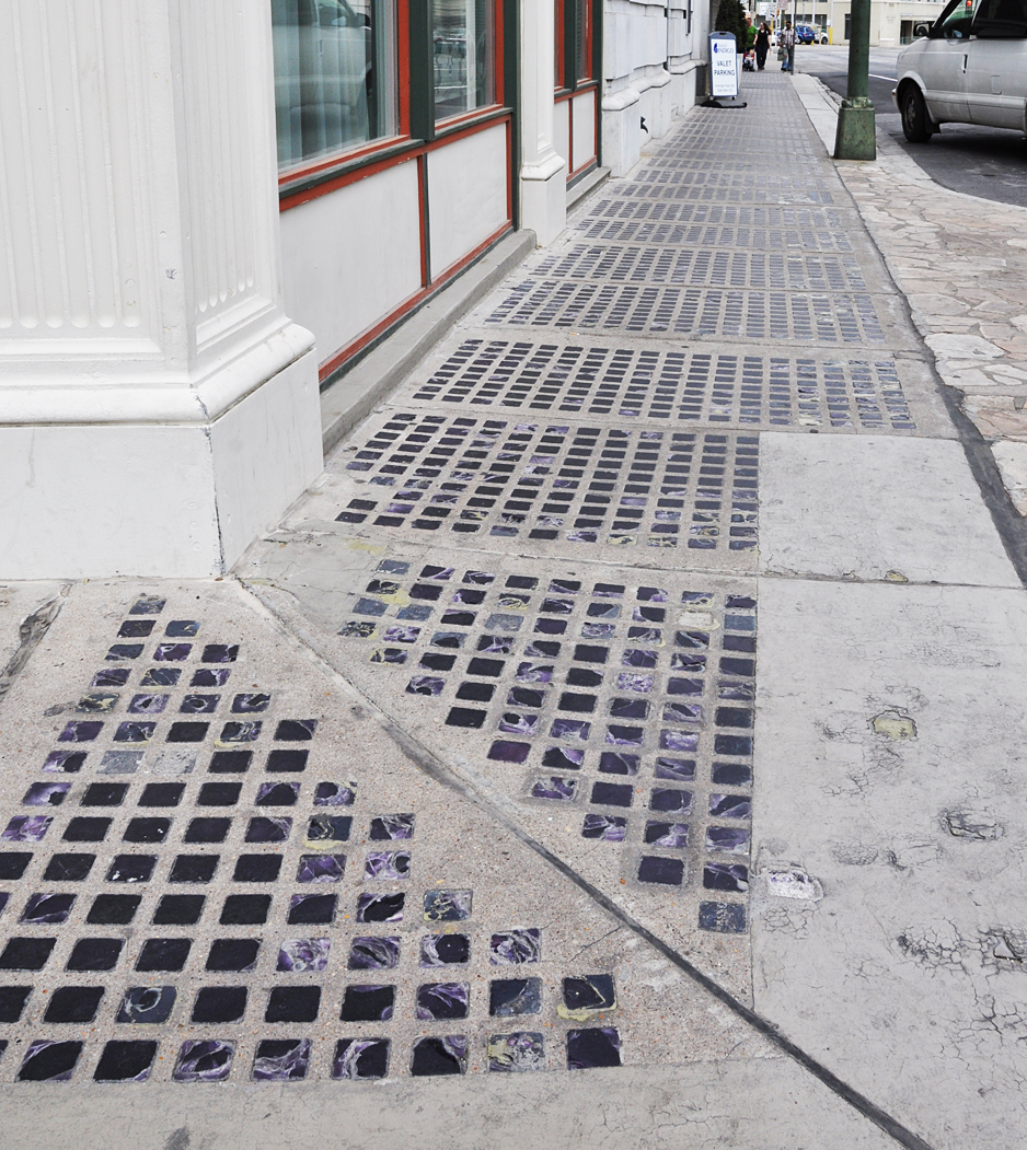 A really neat “glass sidewalk” (my term, don’t know the real word(s)). If you’re unfamiliar, these glass squares brought natural light into basements during the day. And I believe they were also lit from below at night for pedestrians. There are still some in SoHo in NYC — and there must be more elsewhere. What made these extra special was they weren’t clear but purple-y: