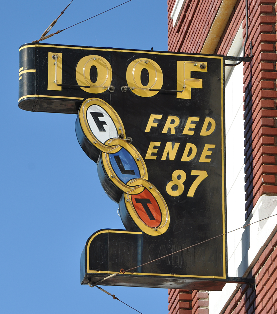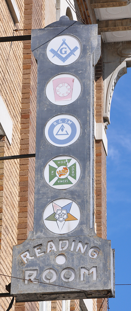 A couple signs from McKinney. This Masonic sign was clearly lit from inside — maybe it still is: