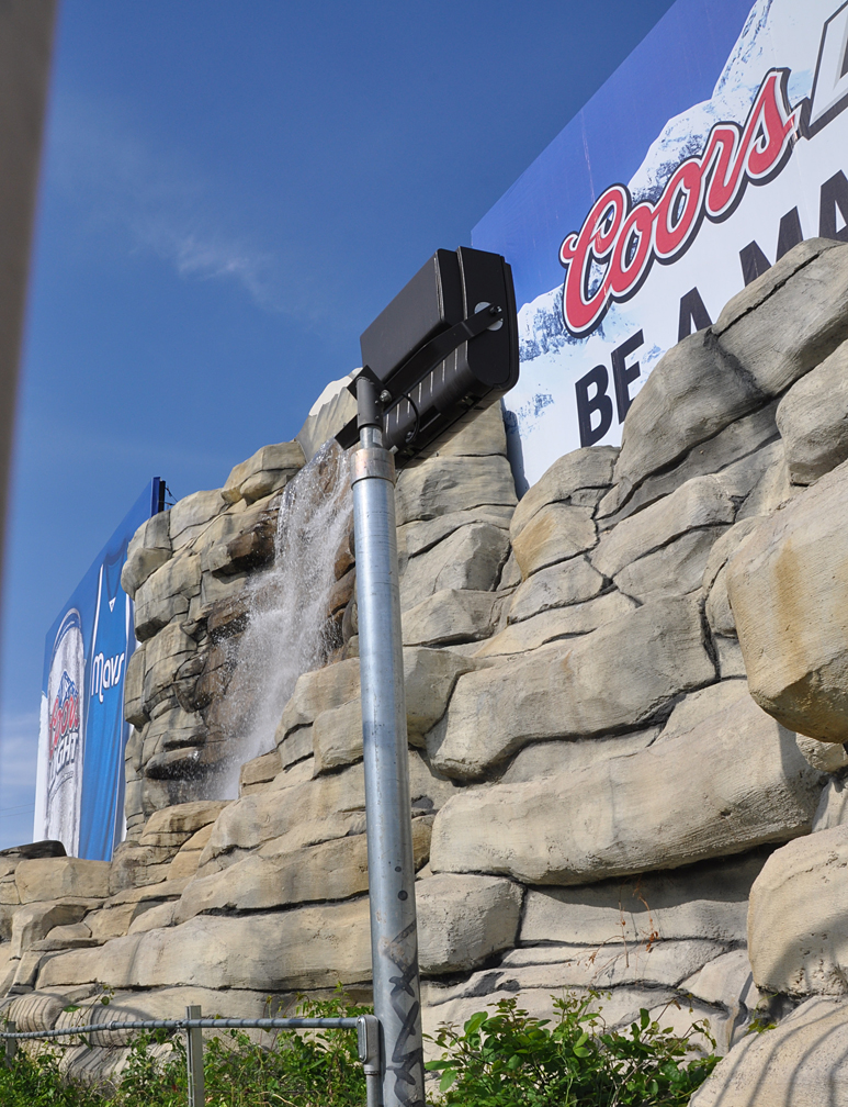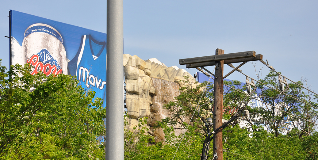 I really, really wanted to get better shots of the waterfall billboard than last time. The best way is from the Stemmons Freeway but it’s so crazy that I’m a little chicken to pull over and shoot. If only those dogs would do a little driving for me sometime! So I tried from below and there were just too many trees — but you can kinda sorta see the waterfall: