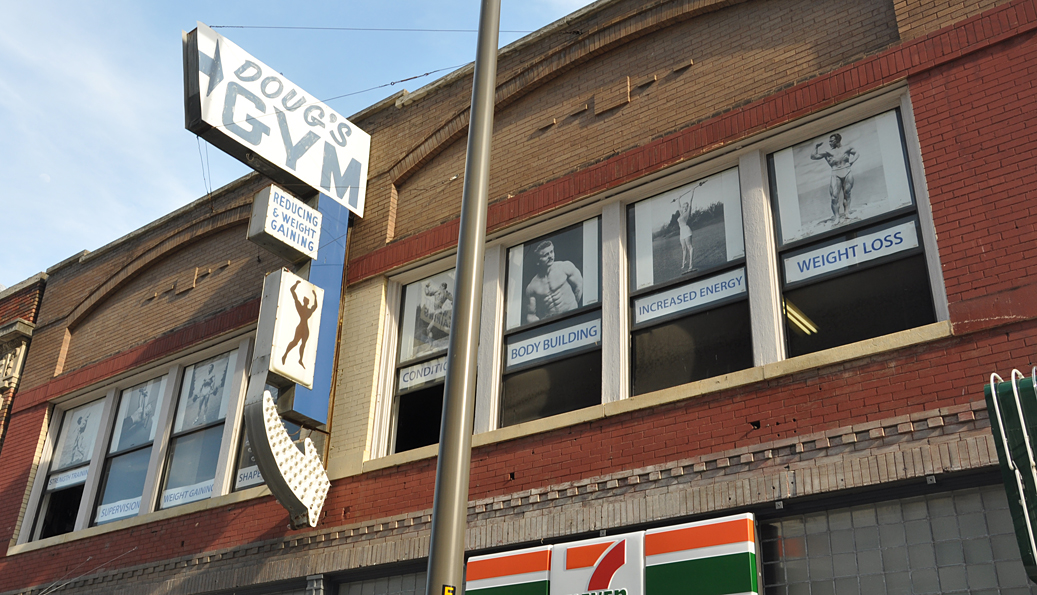 A neat rooftop sign. The business gone, building surrounded by chain link: