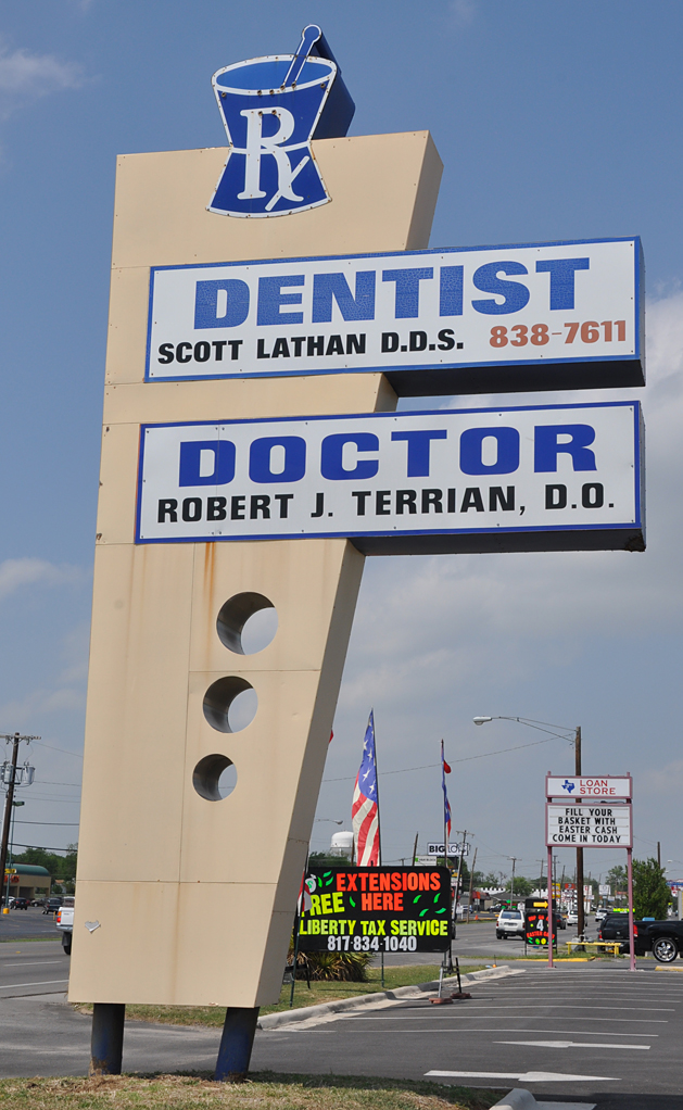 In Irving — this building was vacant so I doubt this sign will be around much longer. Too busy of an area with fast food joints, etc. all over for it to linger like some signs do: