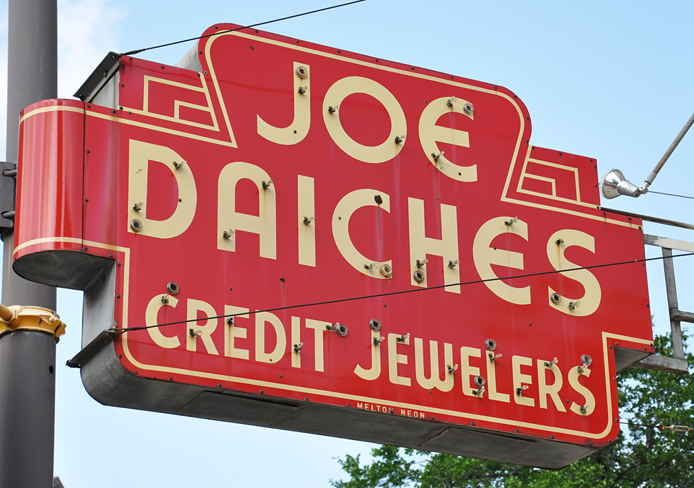 This one from downtown — the store is vacant which means this sign will probably disappear soon. It looks like a 1950s sign that tried to imitate 1930s sort of Art Deco flourishes: