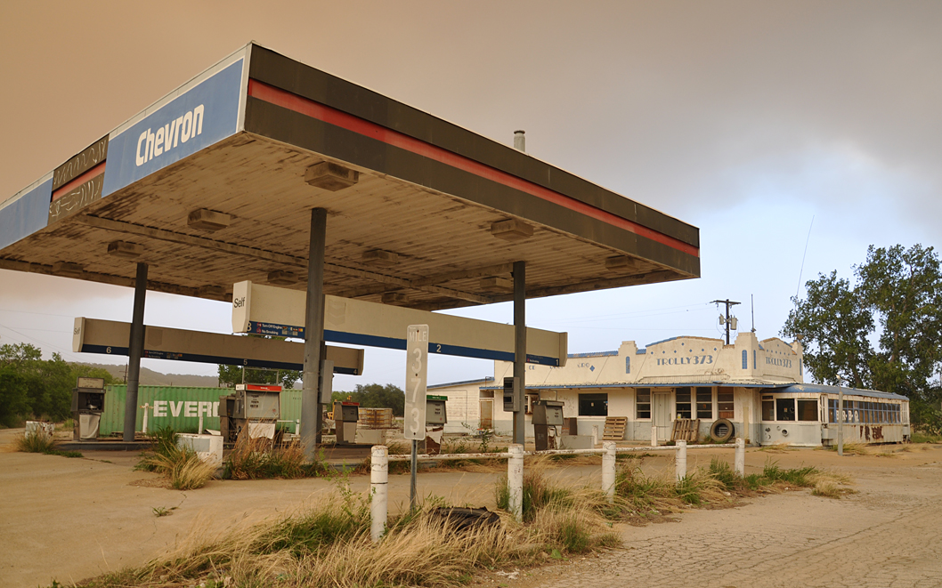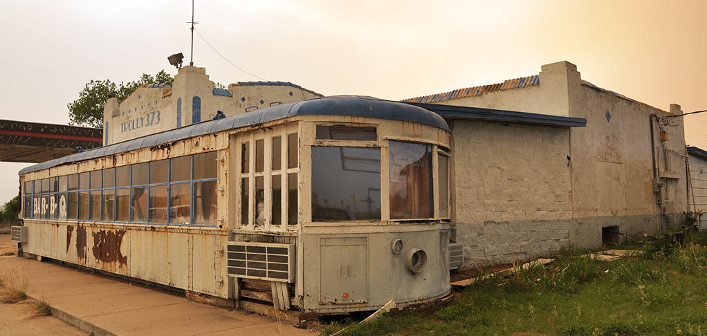 And after breathing smoke all day, into the flames we go. This was in Gordon. I posted a photo of the trolley car building at Flickr — but this gives you a better idea of the clouds & smoke factor. The Trolly (sic) 373 (mile marker 373 on I-20 as you can see) was a restaurant attached to a former Sinclair gas station. This Texaco next door is obviously abandoned now as well: