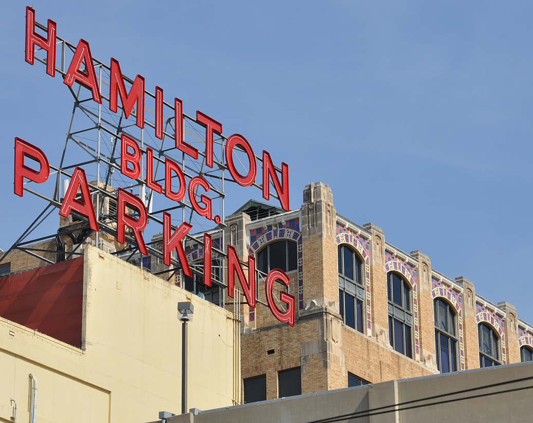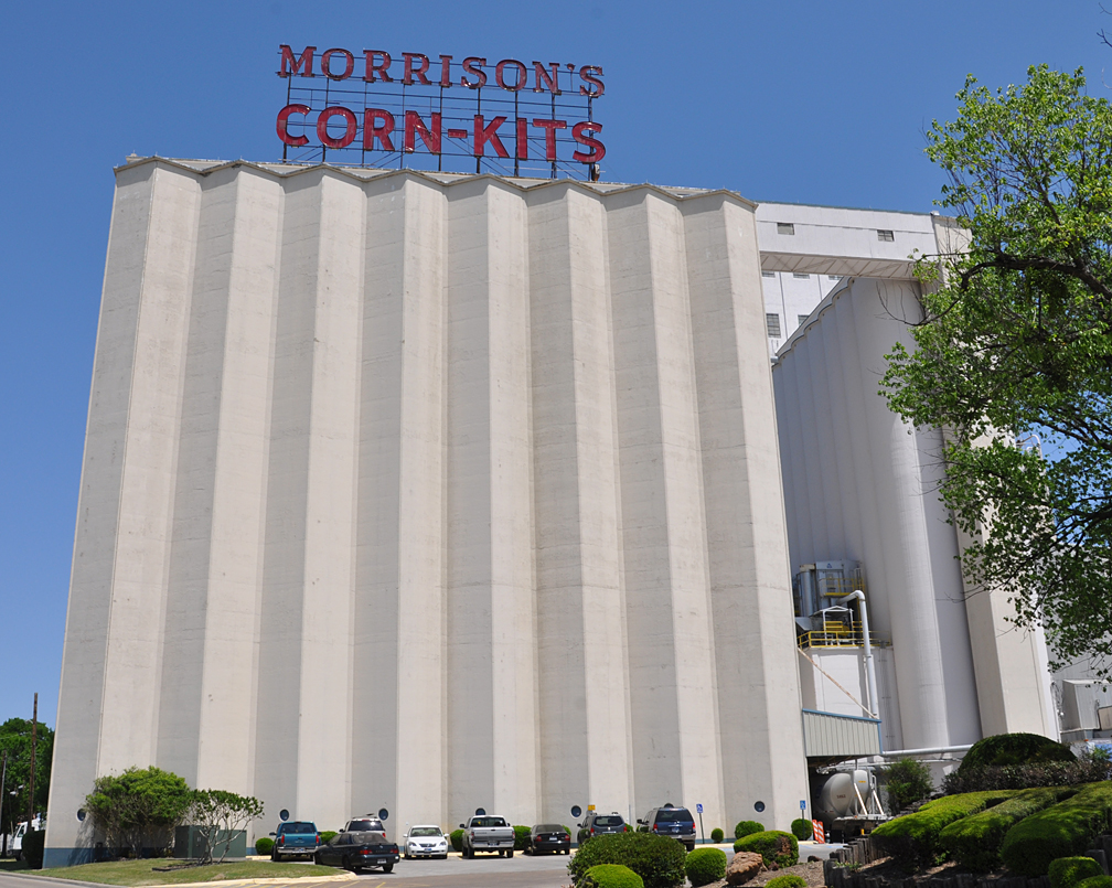 From Denton — neat neon scaffold sign on top of this grain elevator. The cars at the bottom give you scale: