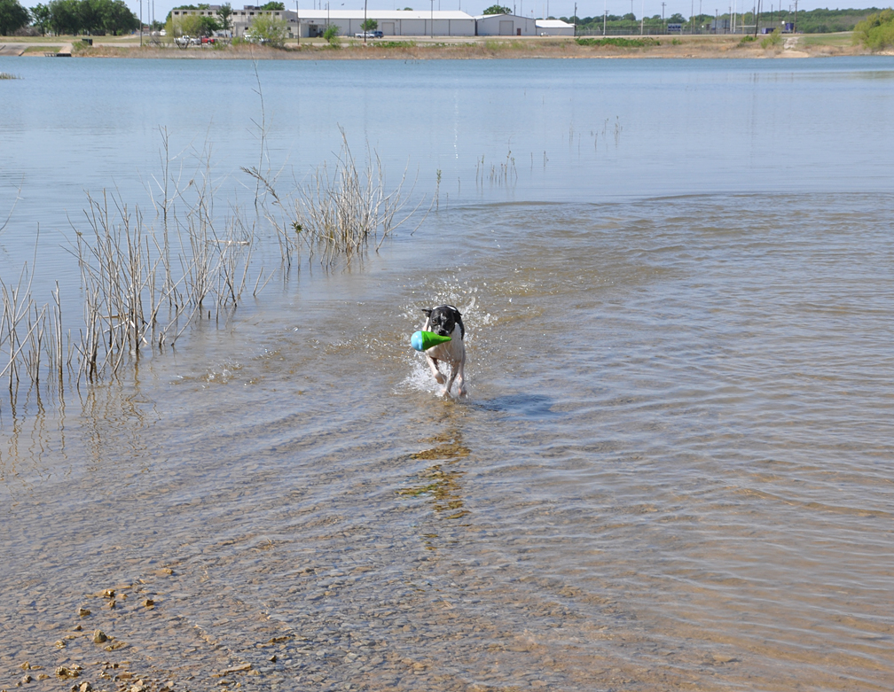 Nik, needs ACTION. One of our favorite new toys of this trip are these Chuck-It designs. I bought all 3 sizes and both designs. Yes, six toys. I probably have 100 toys of various styles for various uses in bins in the back of the van. These shark fin shaped toys bob with the fin up in the water make them easy to spot. Good especially for a one-eyed dog (Nik is blind in his right eye). They also have a gator-head shaped version which is easier to grab for small-mouthed dogs. For those of you that have those Chuck-It plastic throwing devices, these toys work with them as well. Nik is a powerful swimmer and leaves a wake: