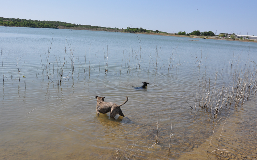 So, here’s the scene that gets repeated about a half dozen times per day. Water break. This was a quiet little spot in Jacksboro — visible from the highway but not anywhere near traffic. Here the waders are hunting for kibble which I’ve tossed in the water. It makes them get wet at least up to their bellies: