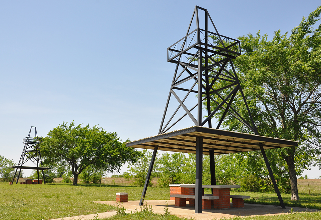 I saw a few rest areas today with these pumpjack (right word, right?) style picnic table canopies. Neat!