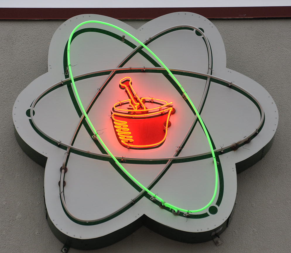 And on a somewhat more cheerful note, I’m trying but it’s not easy today, from Muskogee’s Economy Pharmacy. This sign was probably animated but now just static with the one atomic ring lit: