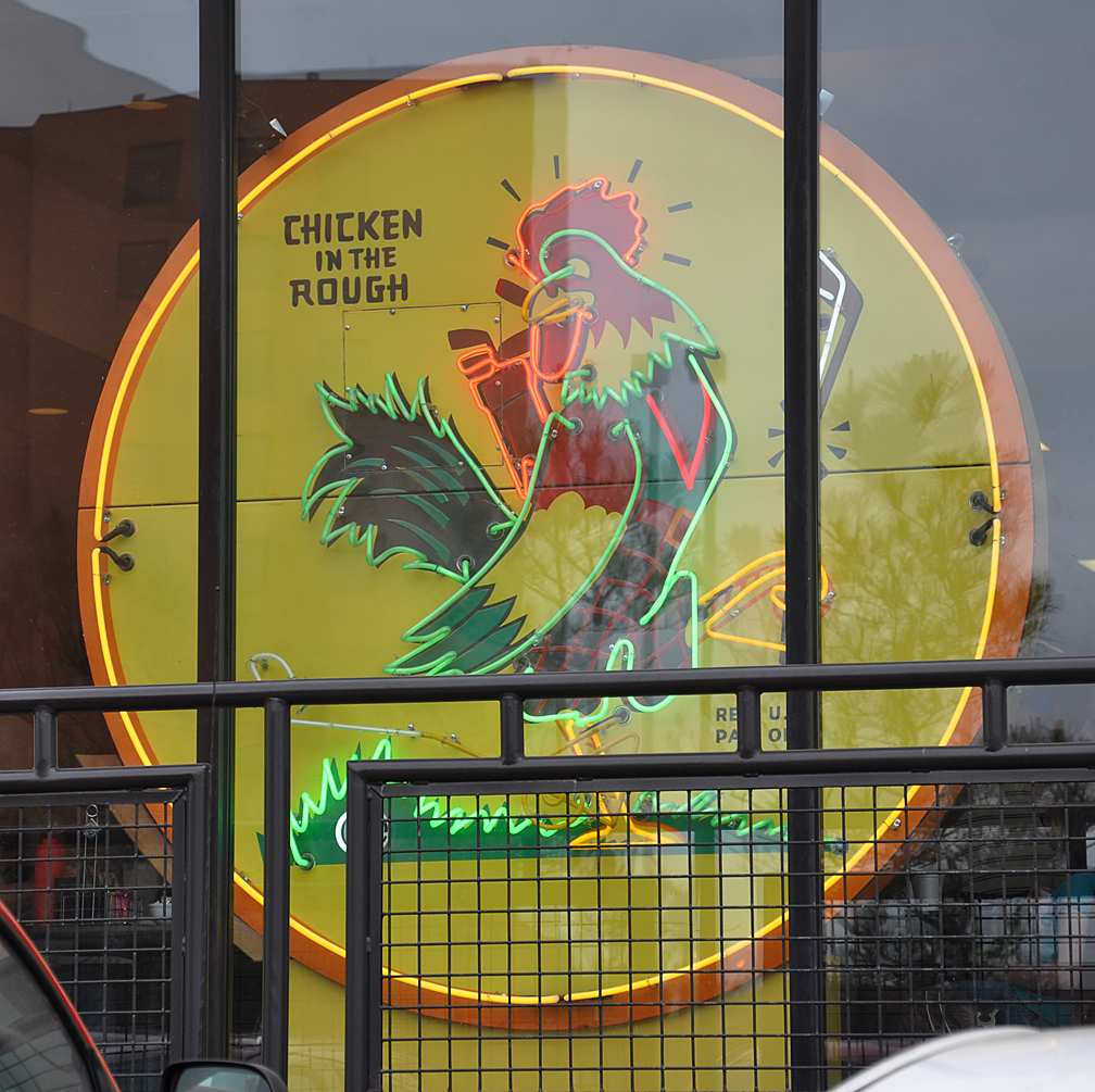 Next up. When Beverly’s moved, they were kind enough to bring along this incredible Chicken in the Rough sign (still animated) — but did they have to shove it in the window like this? I understand they probably weren’t allowed to display it outside (cities are funny like that — any plastic LED crap you want — but not neon fer godsakes). But couldn’t they have made it a solid sheet of glass — or put the damn sign somewhere else inside where you can actually photograph it & see it clearly? And if you want to experience the heartbreak of what the whole sign used to look like in its old location: