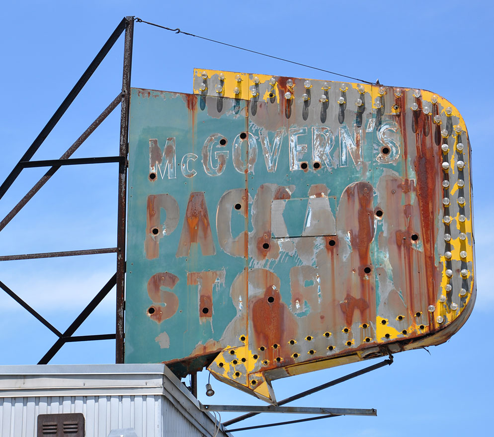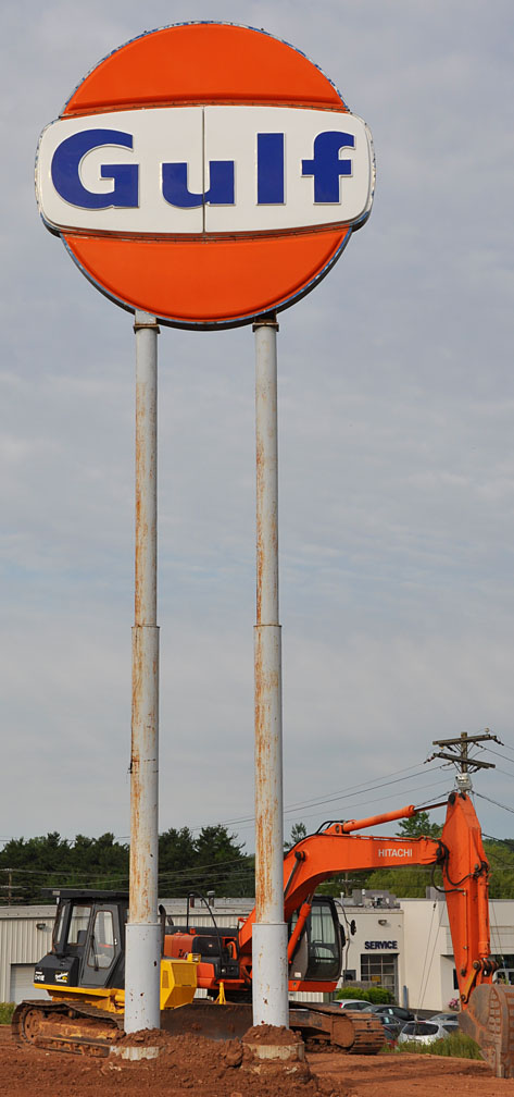 More Meriden. A biggie — meant to be seen from the nearby interstate. The gas station on the lot has been recently demolished. Another Gulf is across the street now. I’m hoping this sign will stay. I like the matching orange dozer. More of a shoveler than a dozer I guess. Not my area of expertise.
