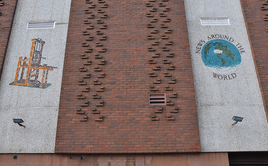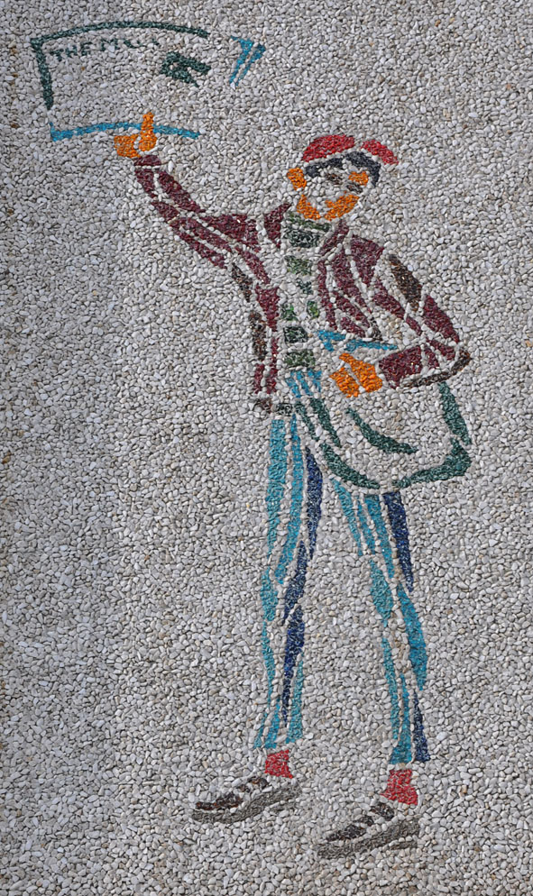 Also in Meriden — at the Record-Journal newspaper building — a paper delivery boy. These murals remind me of those paint-by-numbers kits with rocks instead of paints. Do you remember those?